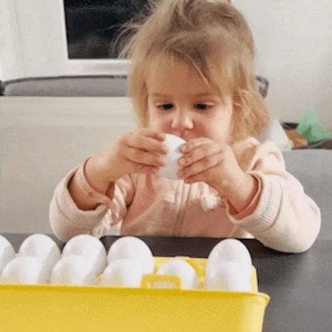 Los niños mayores de 1 año pueden romper fácilmente estos huevos. Algunos niños pueden necesitar aplicar más fuerza, lo cual es algo positivo ya que les ayudará a desarrollar su fuerza muscular y destreza.